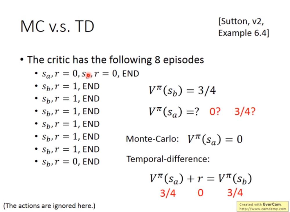 - 若環境有 Markov 的特性(只受上一個狀態影響),則 TD 可能會估比較準,否則 MC 較準